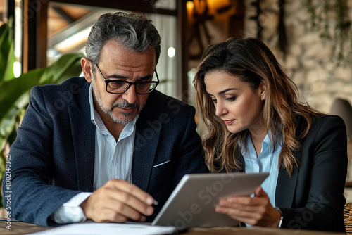 Team of diverse partners mature Latin business man and European business woman discussing project on tablet sitting at table in office. Two colleagues of professional business people working together