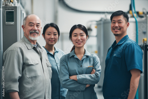 Team of engineers collaborate in modern industrial facility for innovation. Generative AI