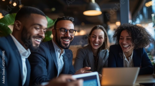 Team of Happy Professionals in Warm Glow of Café Environment