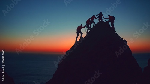 Team of Hikers Helping Each Other Reach Mountain Peak During Vibrant Sunset, Symbolizing Teamwork and Success