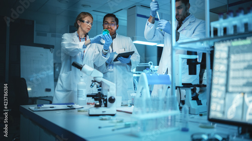 Team of Medical Research Scientists Have Meeting and Conduct Experiments with Help of Virus Samples in Test Tubes and Tablet Computer. Applied Science Laboratory with Diverse Multicultural Colleagues.