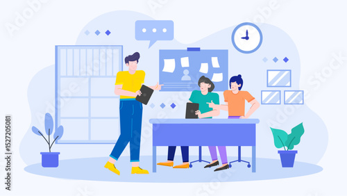 Team of three working in an office, suitable for business presentations, teamwork concepts, office environments in blogs, websites, or social media.