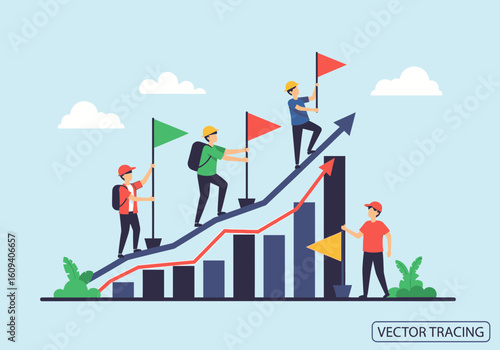 Team of workers climbing a growth chart, symbolizing success and progress.