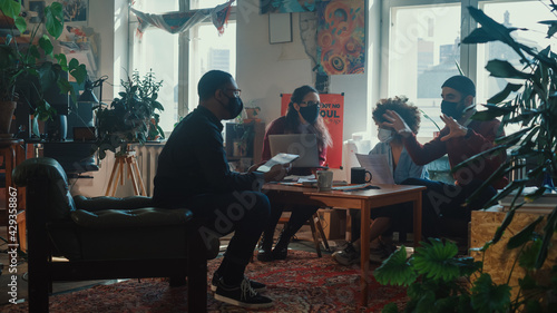 Team of Young Professionals Wearing Face Masks, Talking on a Meeting in Modern Creative Office. Diverse Team of Social Media Marketing Professionals Brainstorm, Share Data on Tablet Computer, Innovate