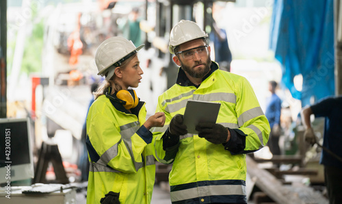 Team technician maintance standing talking at site industry factory. inspector man in factory industry safety service workshop solution. teamwork engineer expertise innovate.