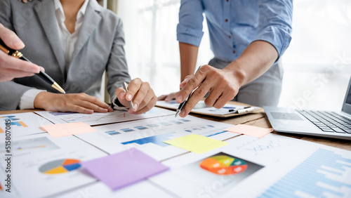 Teams of business people work together in office meeting room to plan activities using graphs and charts.