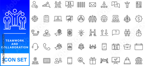 Teamwork and collaboration icon set. Thin line editable stroke icons for teams, leadership, meetings, project management, brainstorming, team growth, support, partnership and remote work.
