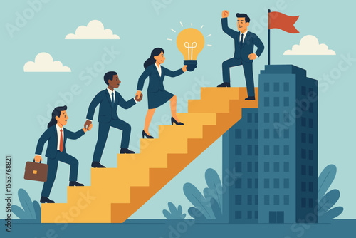 Teamwork and collaboration leading to business success. Diverse corporate team climbing stairs with a leader. Metaphor for career growth, achievement, partnership, and innovation. Vector.