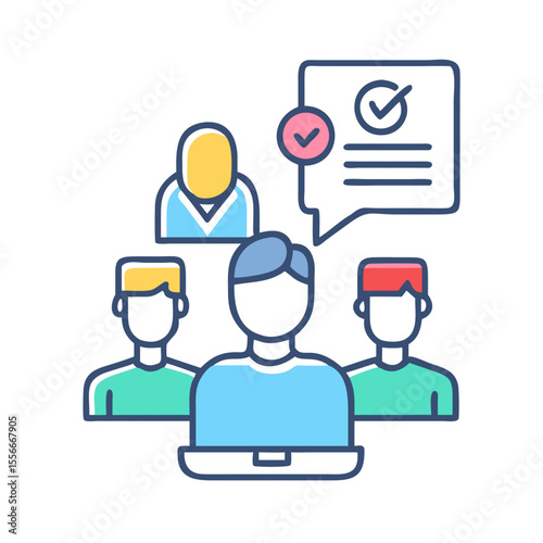 Teamwork and task completion represented by a group of stylized figures with a checkmark icon