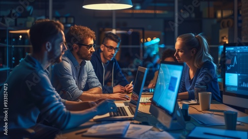 Teamwork, computer and business people at night meeting for planning, online networking and internet. Office, creative startup and men and women on digital tech for research, website and discussion