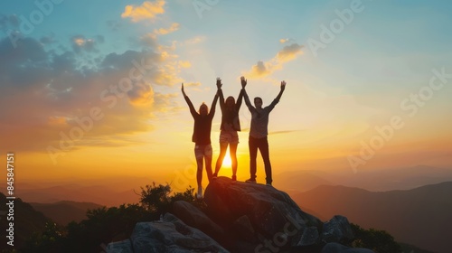 Teamwork concept: diverse group silhouettes raising hands in unity at sunset on hilltop