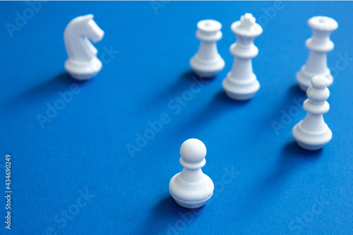 Teamwork concept. White chess pieces on a blue background. Pawn, chess knight and chess queen on a bright background. Abstract background