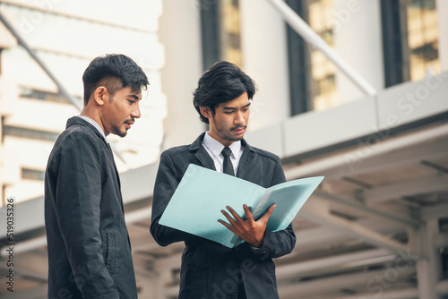 Teamwork men talking outside office partnership. Two Asian businessman talking business partners using financial folder document brainstorm at street city background. Team strategy consulting partner