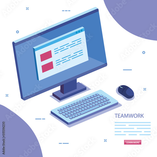 teamwork scene with computer desk icon vector illustration design