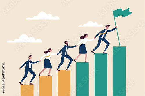 Teamwork to success together, employee career path or partnership support to help business growing, team collaboration or mentor and training concept, business people help team climbing growth chart.