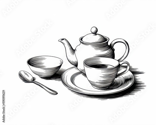 Teapot Cup Saucer Spoon Bowl Still Life Drawing