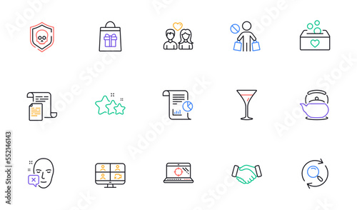 Teapot, Handshake and Martini glass line icons for website, printing. Collection of Holidays shopping, Seo laptop, Report icons. Cyber attack, Donation, Stars web elements. Stop shopping. Vector
