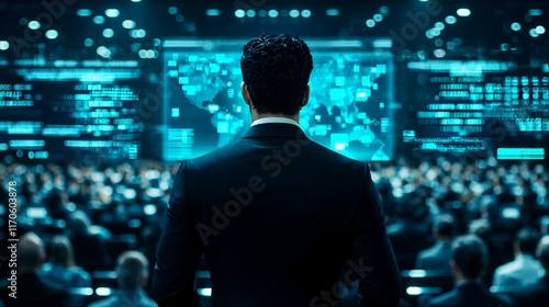 Tech Conference: Speaker Addressing a Large Audience with Data Visualization