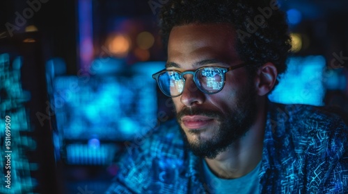 Tech professional analyzing data with holographic interface, symbolizing innovation in digital workspaces