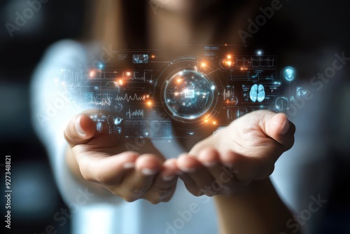 Tech Sphere. Futuristic glowing digital globe in hands technology conc