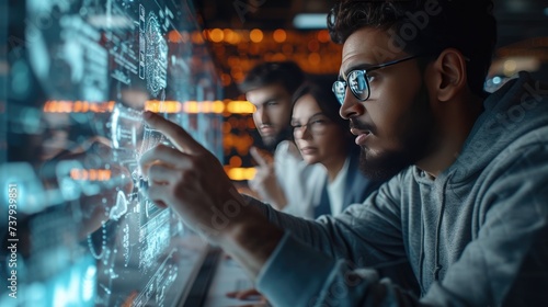 Tech Team Analyzing Advanced Digital Interfaces in a Futuristic Setting, Arabian businessman working on new project with his team, touching hologram display