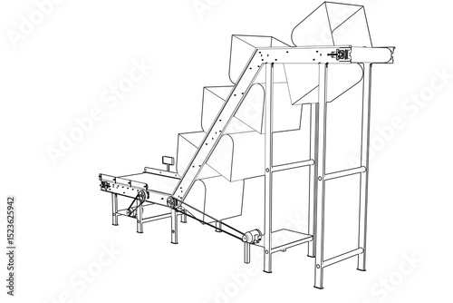 Technical Wireframe Illustration: Vertical Bucket Conveyor Belt for Bulk Material Lifting Transport in Industrial Manufacturing, Food Processing, or Agricultural Production Facilities and Automation