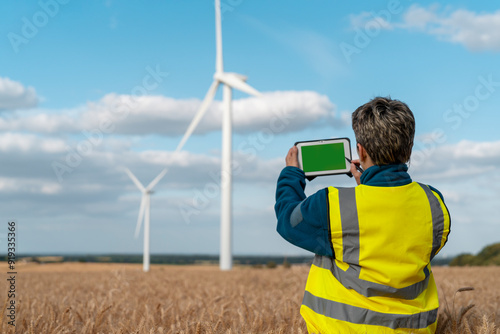Technician analyzes wind turbines in golden field under bright blue sky during afternoon