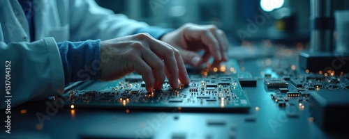 Technician hands work with circuit board, inspecting components. Focus on tech, innovation, semiconductors, digital devices, electronics. Research in lab setting for development, engineering, cyber,