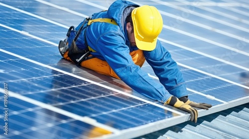 Technician in protective gear inspecting solar panels on a large solar farm with mountains in the background