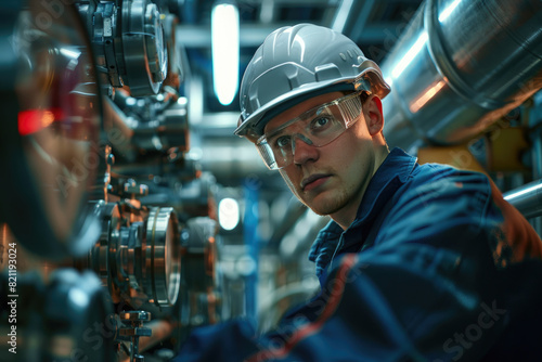 Technician inspecting and maintaining a large industrial system with a variety of tools and equipment. Focused on ensuring operational efficiency in an industrial setting.