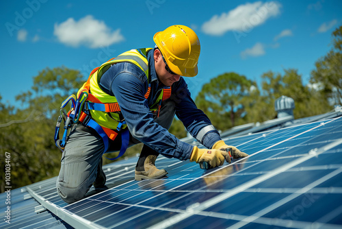 Technician installing solar panels on a rooftop under a clear blue sky during daylight hours