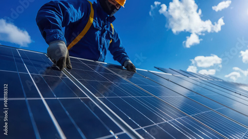 Technician Installing Solar Panels Under Bright Blue Sky with Fluffy Clouds and Sunlight