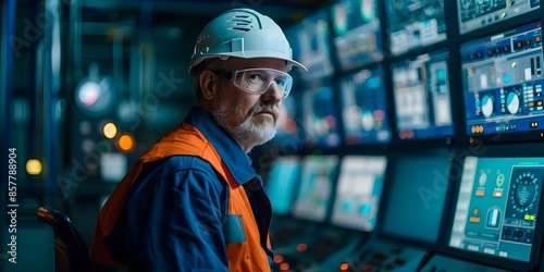 Technician monitors power plant operations in industrial pipeline control room. Concept Power Plant Operations, Industrial Monitoring, Pipeline Control, Technician Responsibilities
