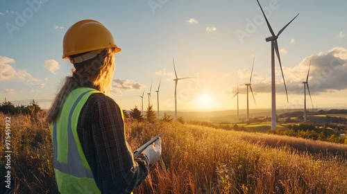 Technician performing a routine check on turbine blades at a wind farm, bright sunlight creating a vibrant scene, detailed focus on the blade inspection process and technician tools, with a backdrop