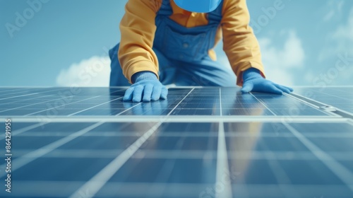 Technician securing solar panels on a roof, showcasing the process of green energy generation, renewable energy installation, eco-friendly power solutions, and sustainable living practices
