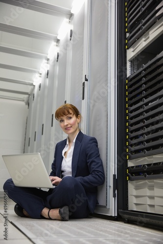 Technician sitting on floor beside server tower using laptop