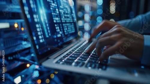 Technician troubleshooting cloud computing issues in a data center, focusing on software analysis and system connectivity