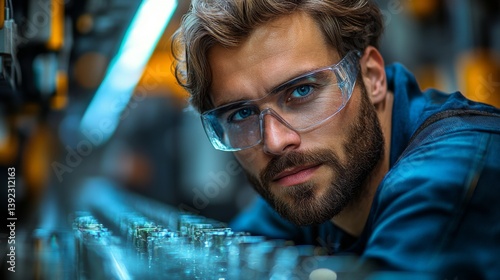 Technician wearing protective gear examines tools in a busy manufacturing plant specializing in mining and metallurgy. Bright lighting adds to the industrious atmosphere of the workspace.