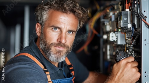 technician with a beard and tousled hair concentrates on repairing intricate electrical components inside a high-tech workshop filled with tools and wires