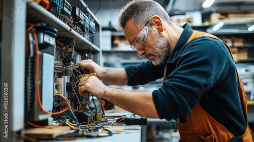 Technician working on electrical components in a workshop, wearing safety glasses and using tools to fix a circuit board with various wires and electronic parts.