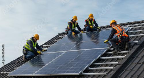 Technicians perform solar panel maintenance and upgrades on rooftop