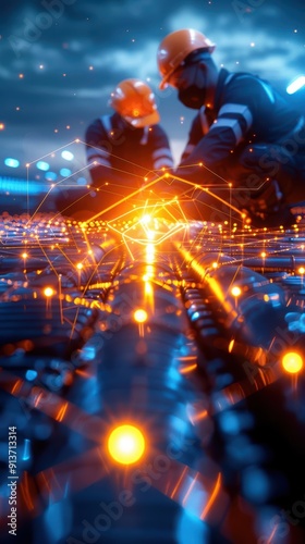 Technicians working on digital systems, surrounded by glowing connections, showcasing technology and teamwork in a futuristic setting.
