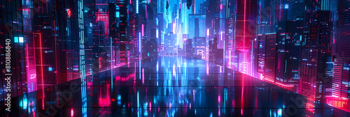 techno glow in cyberpunk cityscape featuring a towering skyscraper, a bustling street, and a bustling river