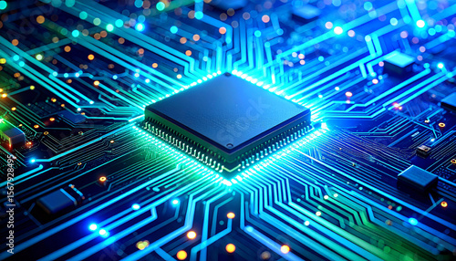 Technological Circuitry: A high-angle perspective of a computer microchip showcases intricate circuits and glowing elements, symbolizing innovation and connectivity.