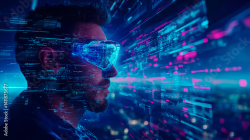 Technological Immersion: Person Wearing VR Headset in a Futuristic Data Stream