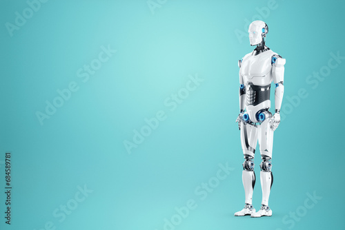 Technological modern robot body full body , photorealism. Neural networks and Artificial Intelligence, technology, AI analyzing information. 3D illustration, 3D rendering, copy space.