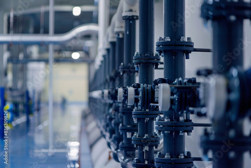 Technologically advanced water purification plant, with intricate piping and monitoring systems in action