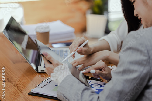Technology and financial advisory services concert. Business teamwork and working on digital laptop computer with advisor showing plan of investment to clients at table office. Digital marketing.