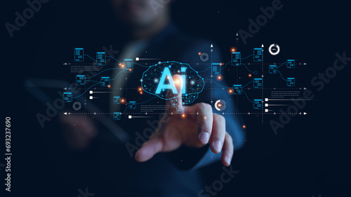Technology and people concept man use AI to help work, AI Learning and Artificial Intelligence Concept. Business, modern technology, internet and networking concept. AI technology in everyday life.