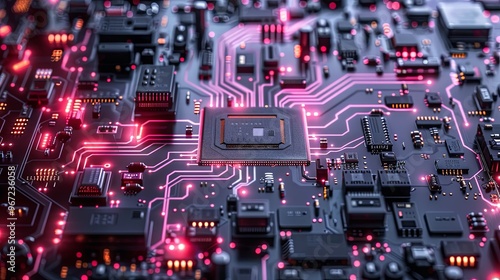 Technology background featuring a circuit board. Central computer processor (CPU) concept with digital motherboard chip.